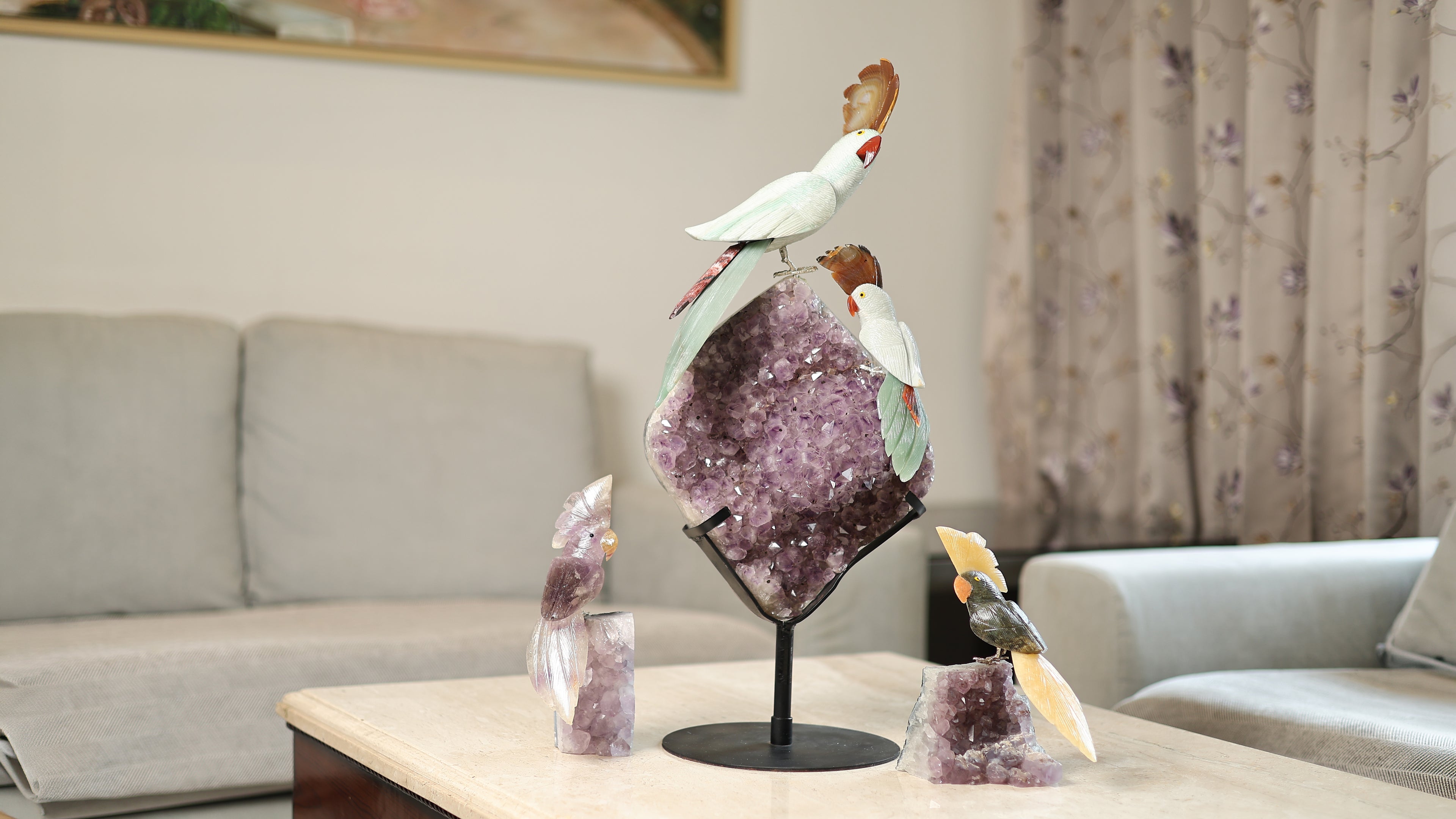 Celestara Amethyst Geode Gemstone Bird Sculpture – Handcrafted Crystal Birds Luxury Home Décor, Feng Shui Healing Showpiece on Metal Stand 26 Inch, 10.8 kg