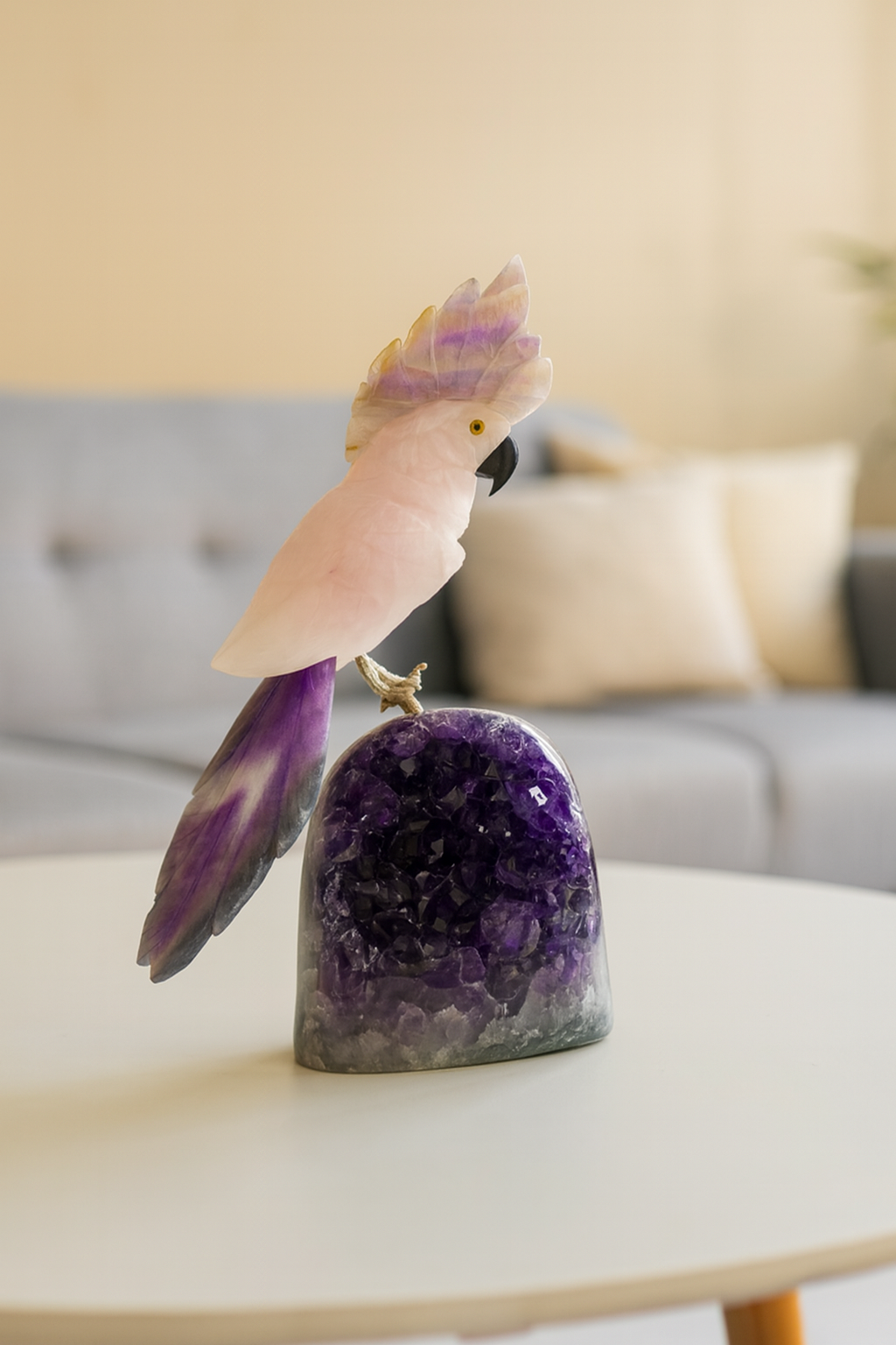 This exquisite handcrafted gemstone bird showcases a body carved from Rose Quartz, renowned for its gentle, loving energy. Its crown and tail are sculpted from Purple Agate, a stone celebrated for balance, grounding, and inner strength. The bird is perched elegantly on a base of natural White Quartz, which radiates clarity and amplifies the energies of the surrounding crystals.