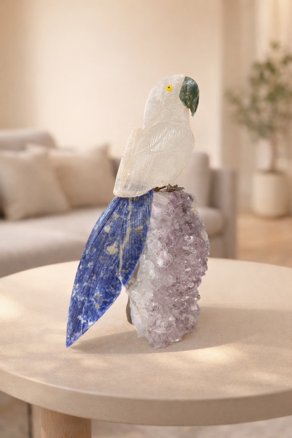 Aurex Bird features a delicately carved Clear Quartz body, symbolizing clarity, purity, and positive energy flow. Its graceful Sodalite tail adds a rich blue contrast, known for encouraging calmness, intuition, and balanced communication. The bird is securely perched on a natural Amethyst crystal base, whose raw crystalline texture enhances the organic charm while radiating peaceful, grounding vibrations.