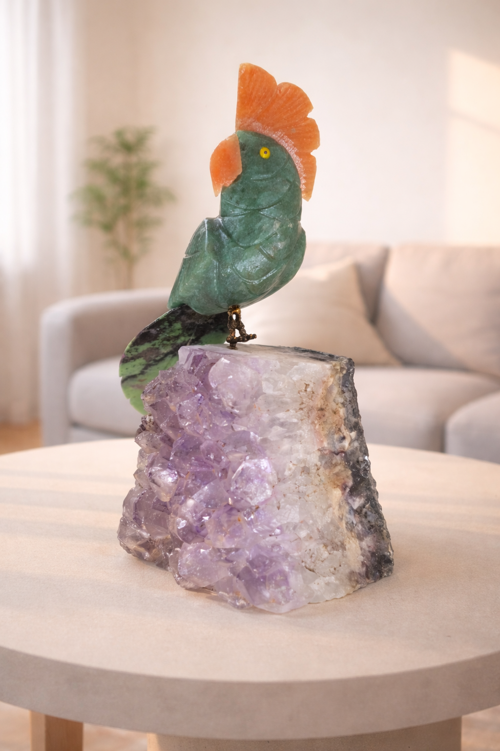 The Aurum Verde is a finely handcrafted gemstone décor piece that brings together elegance, balance, and natural energy. Carved with precision, the bird’s body is made from Green Jade, symbolizing harmony and growth, while its Ruby Zoisite tail adds a vibrant accent of passion and vitality. The sculpture is gracefully perched on a raw Amethyst crystal base, creating a striking contrast between polished artistry and natural crystal beauty.