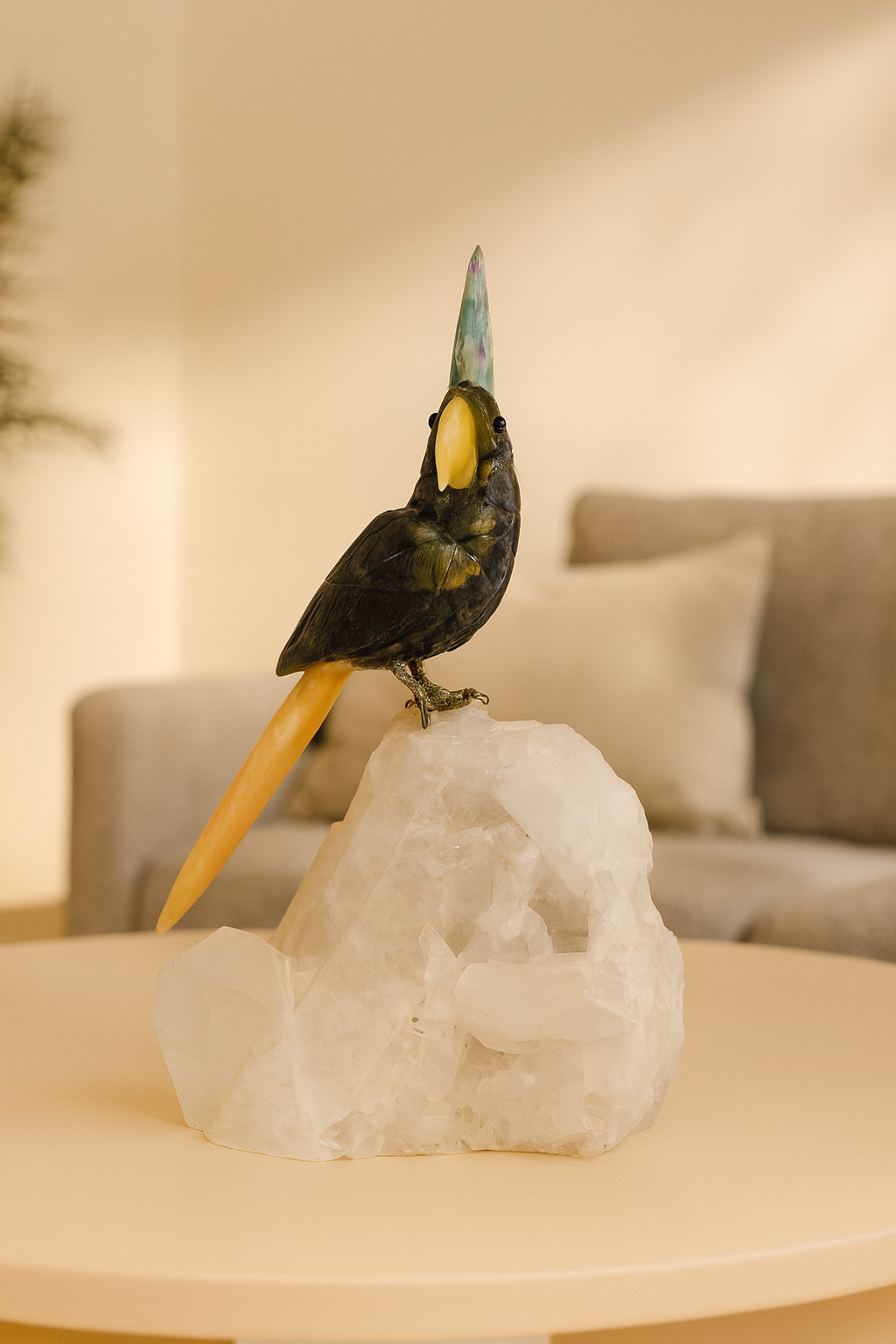 This exquisite handcrafted bird sculpture is a masterpiece of artistry and natural beauty, bringing together rare and powerful gemstones in a single creation. The body of the bird is intricately carved from Black Tourmaline, known for its strong grounding and protective energies. Its crown is Ruby Zoisite, a stone of vitality and harmony, while the tail is Yellow Calcite, radiating positivity and confidence. The sculpture is elegantly perched on a solid White Quartz base, which amplifies the energies of all surrounding stones, enhancing their benefits and adding a luminous glow to the décor.
