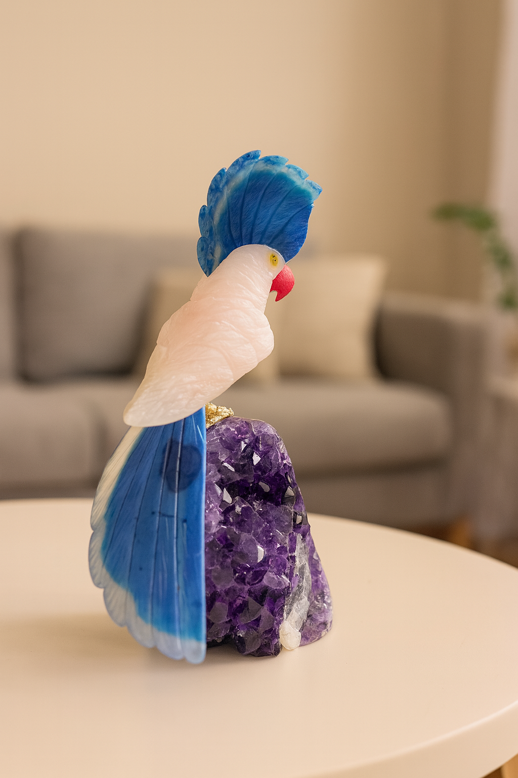 Bring home a symbol of elegance and healing energy with this hand-carved gemstone bird sculpture. The bird’s body is crafted from Rose Quartz, known as the stone of love and harmony, while its crown and tail are sculpted from Blue Agate, a stone celebrated for calmness, truth, and balance. The figurine rests gracefully on a solid White Quartz base, a crystal revered for clarity and amplifying positive energies.