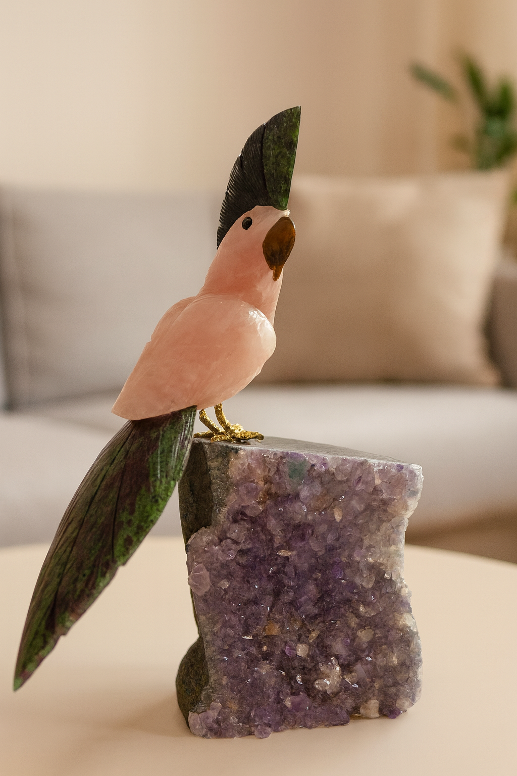 This exquisite handcrafted gemstone bird is a true statement of elegance and artistry. The body is sculpted from Rose Quartz, a stone of love and harmony, giving it a soft blush-pink charm. Its tail and crown are carved from Ruby Zoisite, blending deep green with hints of ruby inclusions, symbolizing vitality and growth. The bird is gracefully perched on a natural Amethyst base, known for its calming energy and spiritual balance. Together, these gemstones create a visually captivating and energetically powerful masterpiece.