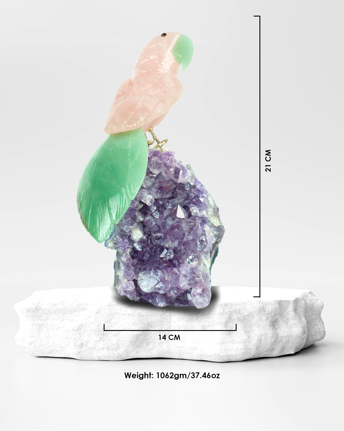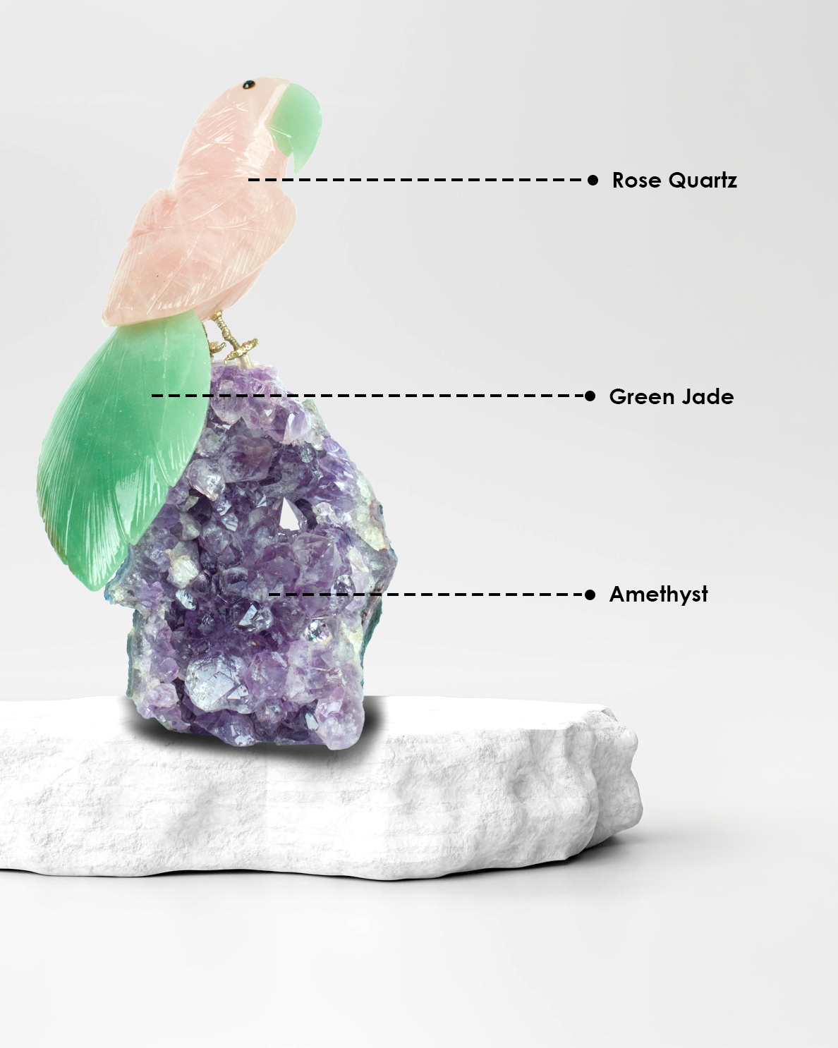 The Heartleaf Bird is a gentle embodiment of love, emotional healing, and natural harmony. Sculpted from the soft pink hue of Rose Quartz and the grounding green of Jade, this gemstone bird invites peace, balance, and the beauty of moving forward with an open heart.