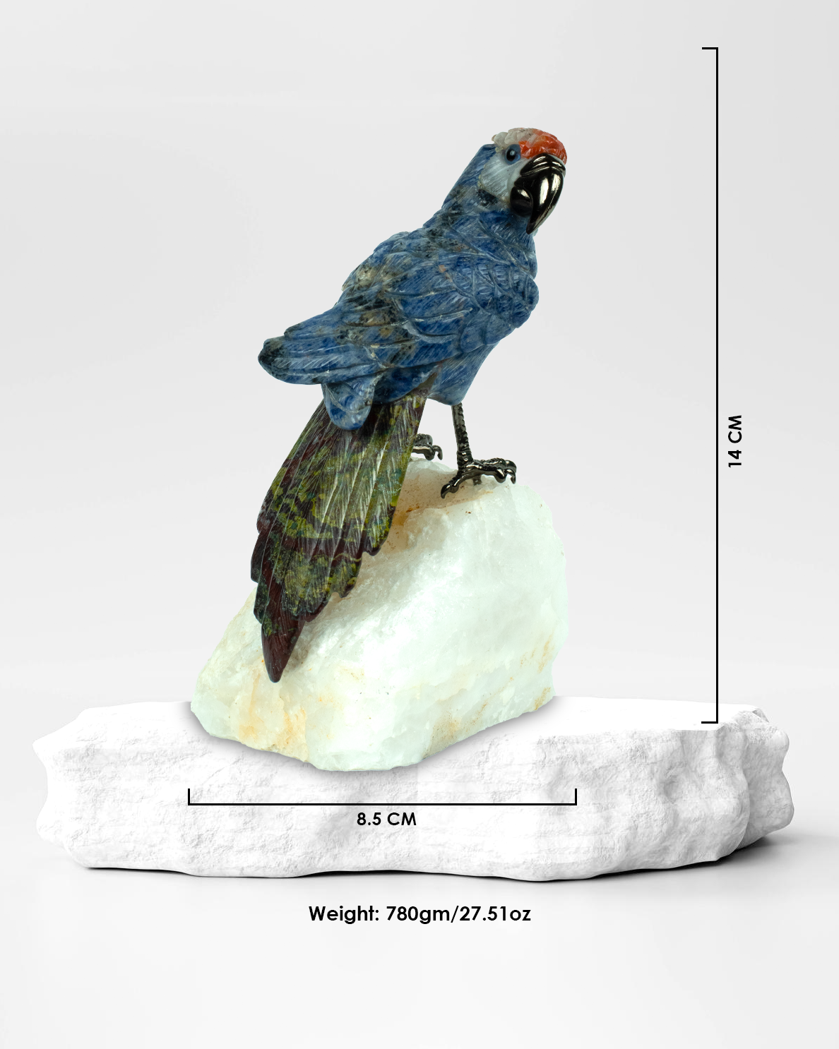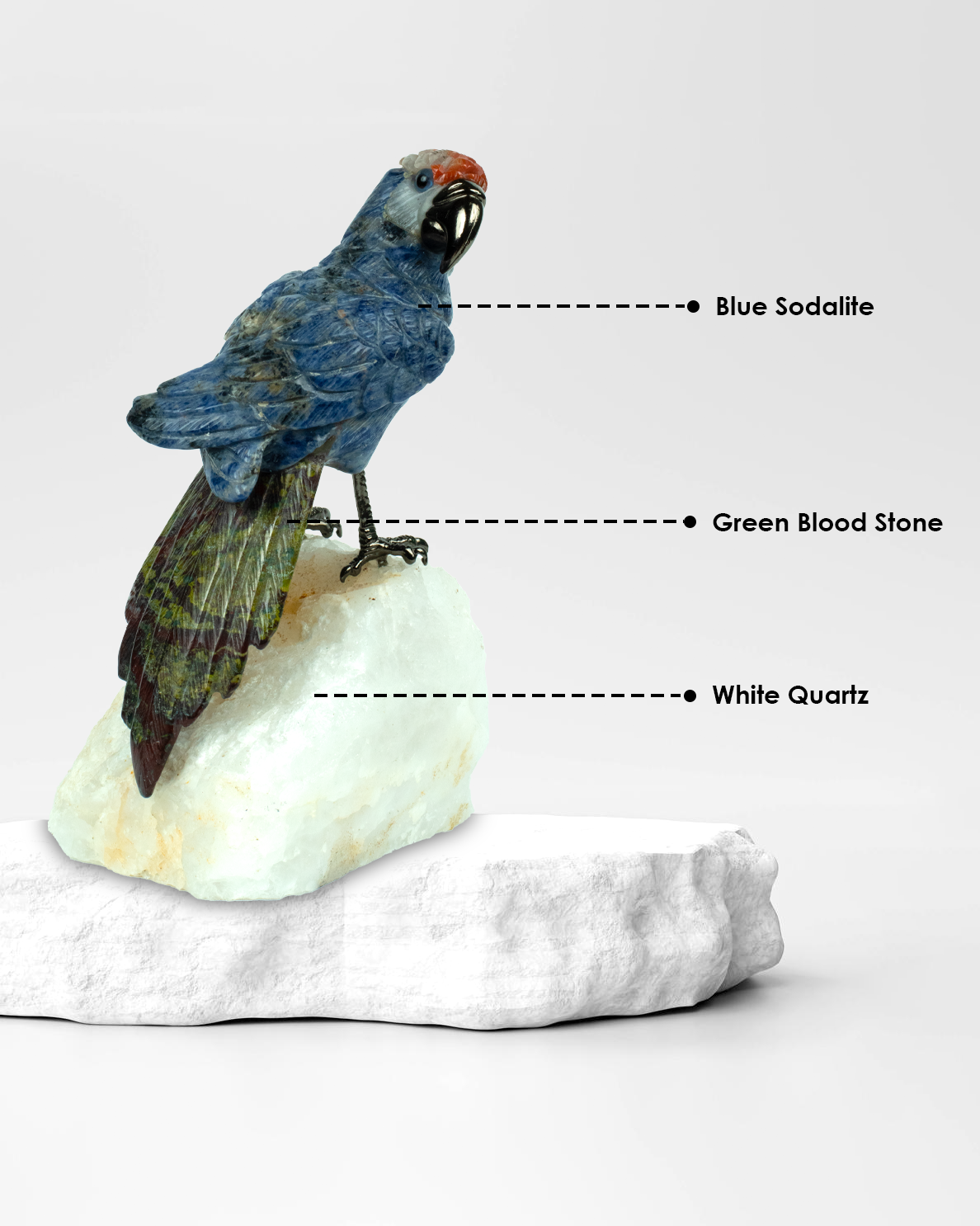 Elevate your space with the serene energy of the Love Guardian, a handcrafted gemstone sculpture that embodies wisdom, clarity, and grounding. This unique bird features a deep Blue Sodalite body, a Green Bloodstone tail, and a radiant White Quartz base—each crystal thoughtfully chosen for its healing power and symbolic meaning.