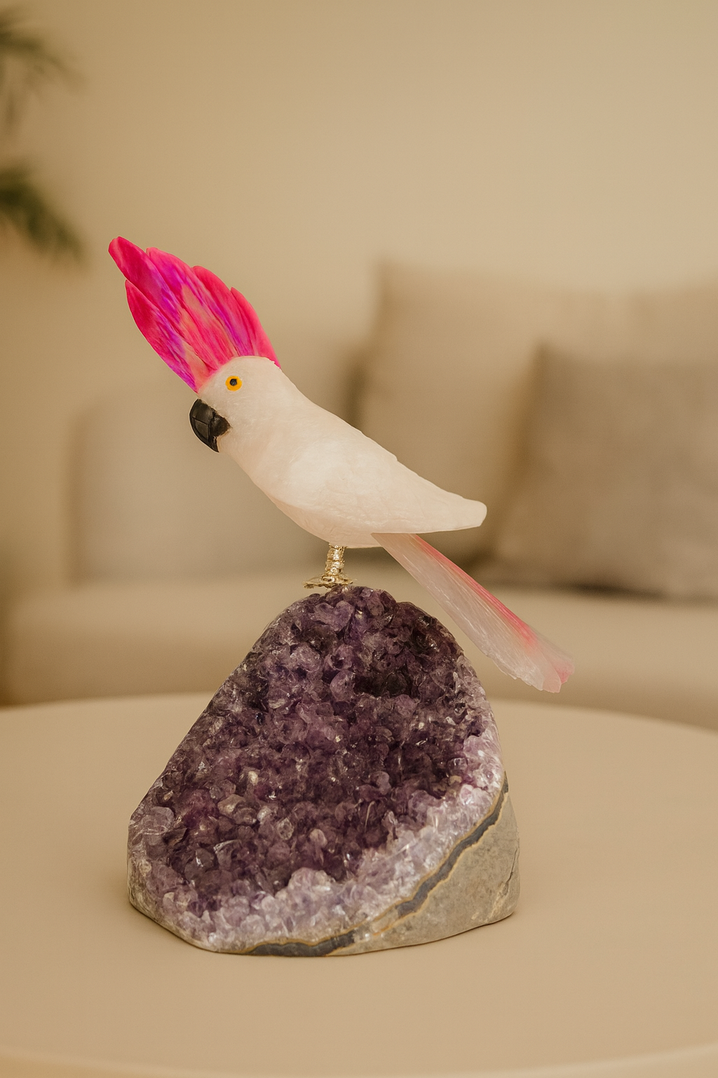 This exquisite handcrafted gemstone bird is a true statement piece that blends elegance, artistry, and healing energy. The body is sculpted from Rose Quartz, the stone of unconditional love and emotional healing, while the crown and tail are carved from Pink Agate, known for its balancing and soothing properties. The bird rests gracefully on a White Quartz base, a stone celebrated for its clarity, purification, and energy amplification.