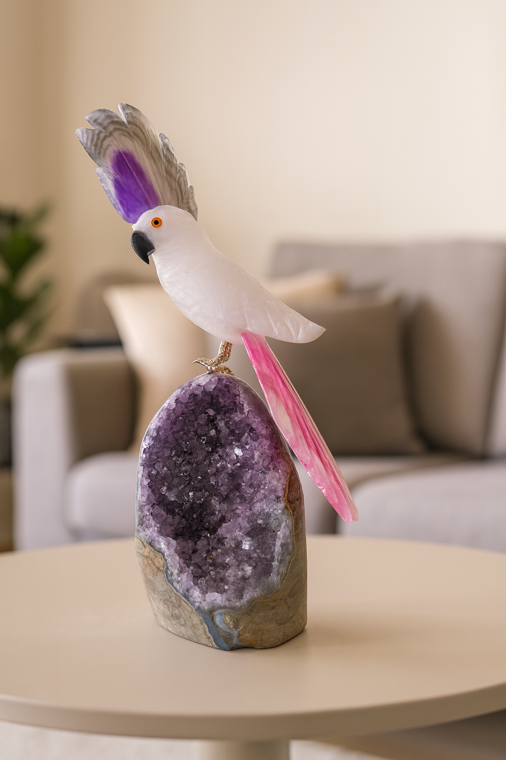 Bring home a stunning blend of artistry and natural gemstones with this handcrafted cockatoo sculpture. Perched gracefully on a base of White Quartz, this unique creation symbolizes elegance, healing energy, and timeless beauty.