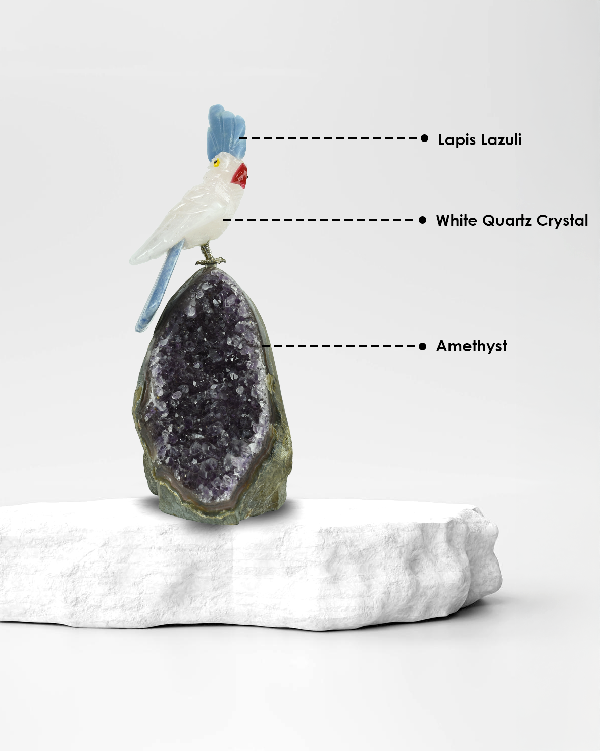 🤍 Body: Made from luminous White Quartz Crystal, the bird’s body symbolises clarity, healing, and amplified energy. It reflects light beautifully, representing purity and a higher state of consciousness.