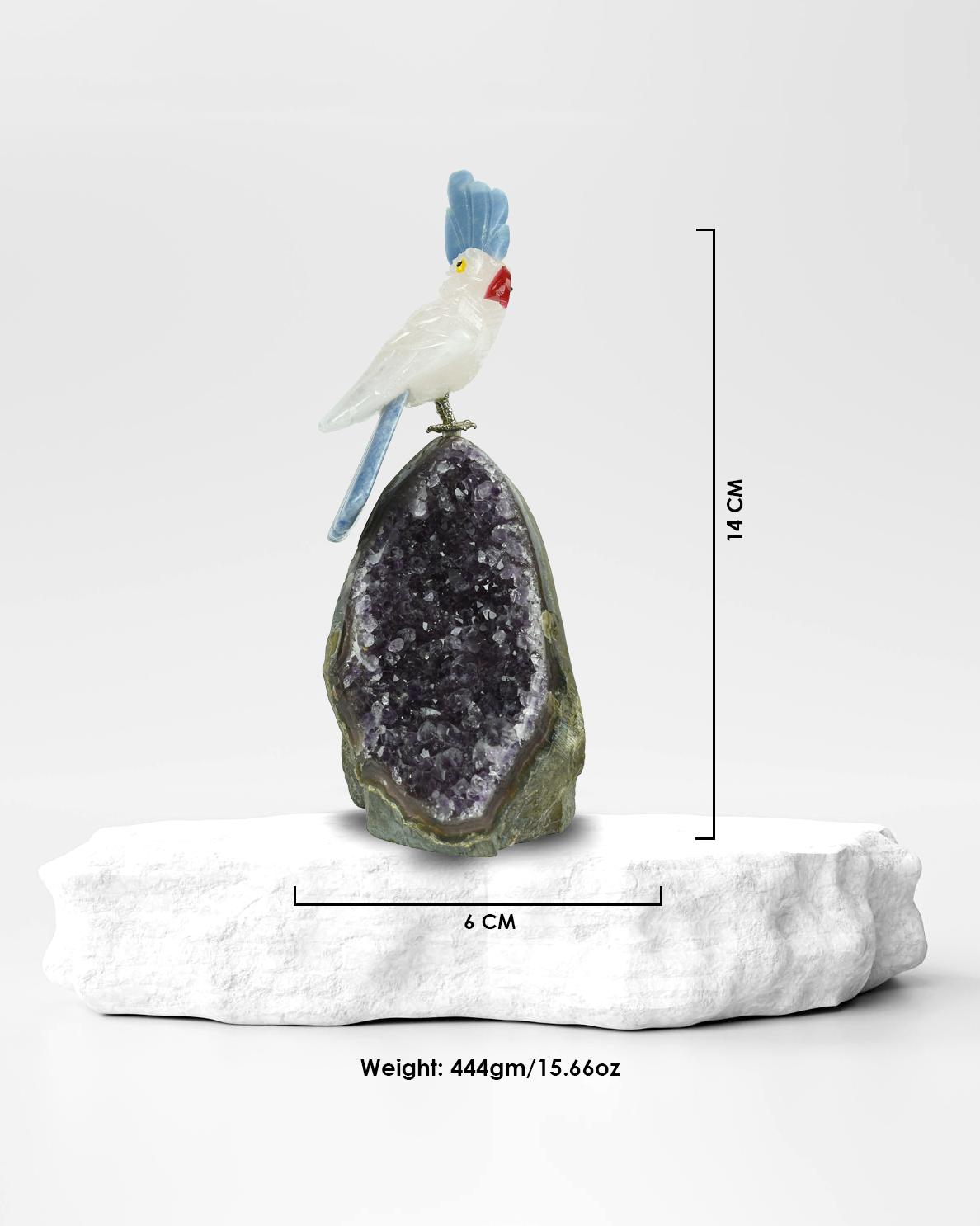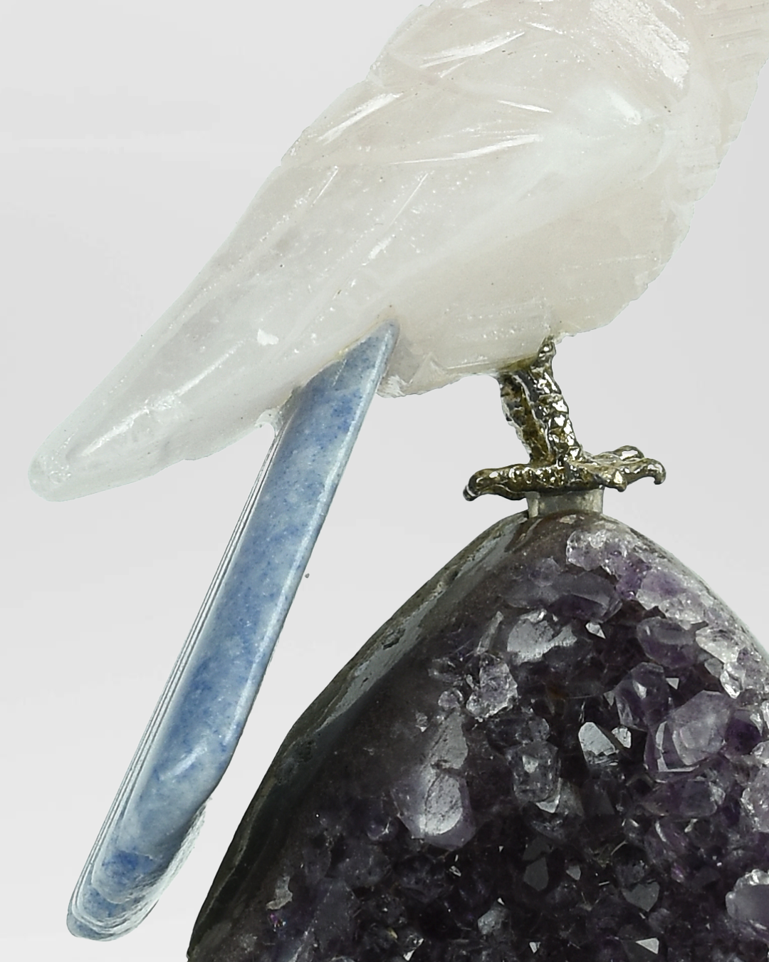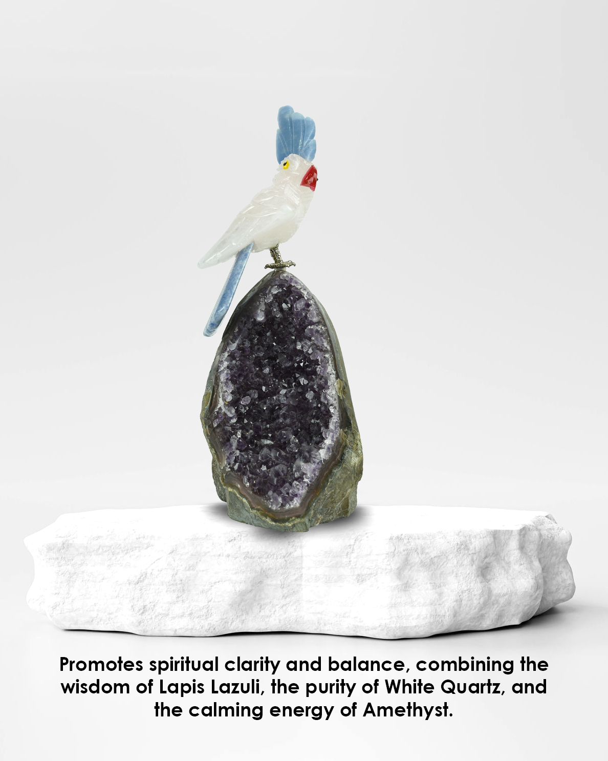 💜 Base: Perched atop a glistening Amethyst cluster, this bird radiates peace, spiritual grounding, and protection. Amethyst enhances intuition and provides a calming aura wherever it rests.