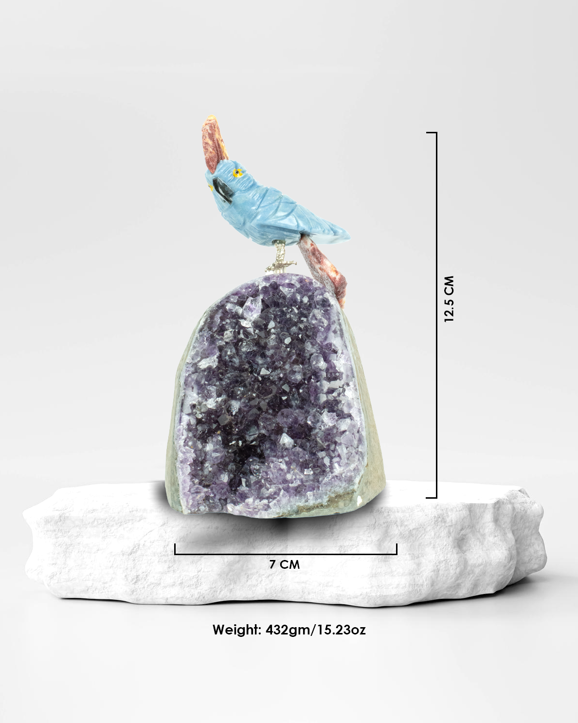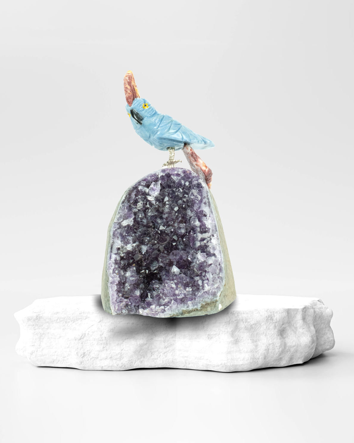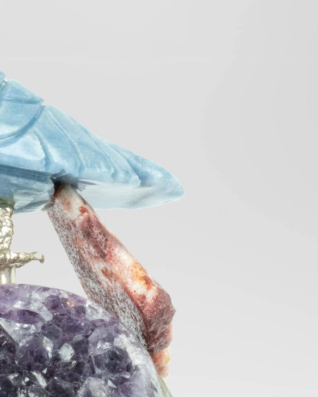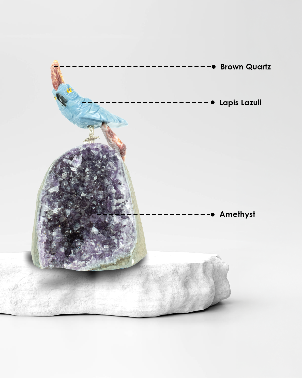 The crown and tail of the bird are crafted from Brown Quartz, a stone known for its deeply grounding, stabilizing energy. Often associated with the root chakra, Brown Quartz connects us to the earth, helping to anchor spiritual insights into reality, release fear, and promote emotional resilience.