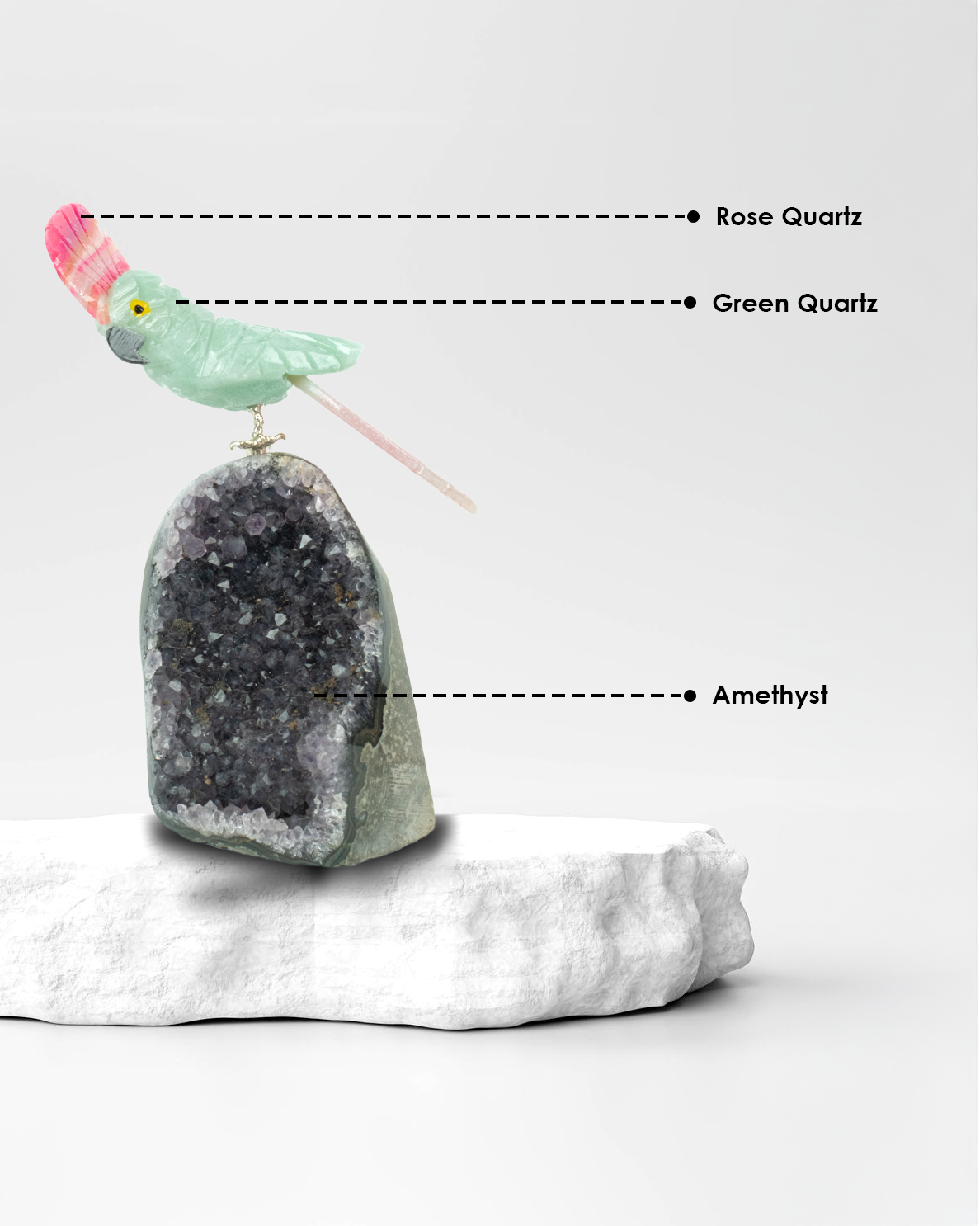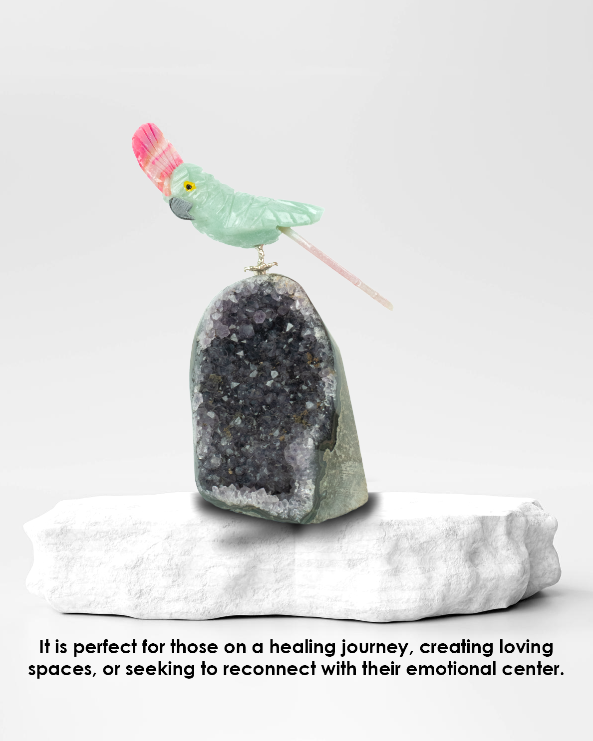 A symbol of healing, renewal, and unconditional love, the Heartwood Harmony Bird is a masterfully crafted gemstone sculpture that embodies emotional balance and nurturing energy. Made with two heart-centered crystals — Green Quartz and Rose Quartz — this gentle bird brings forth the serene beauty of nature and the quiet strength of compassion.