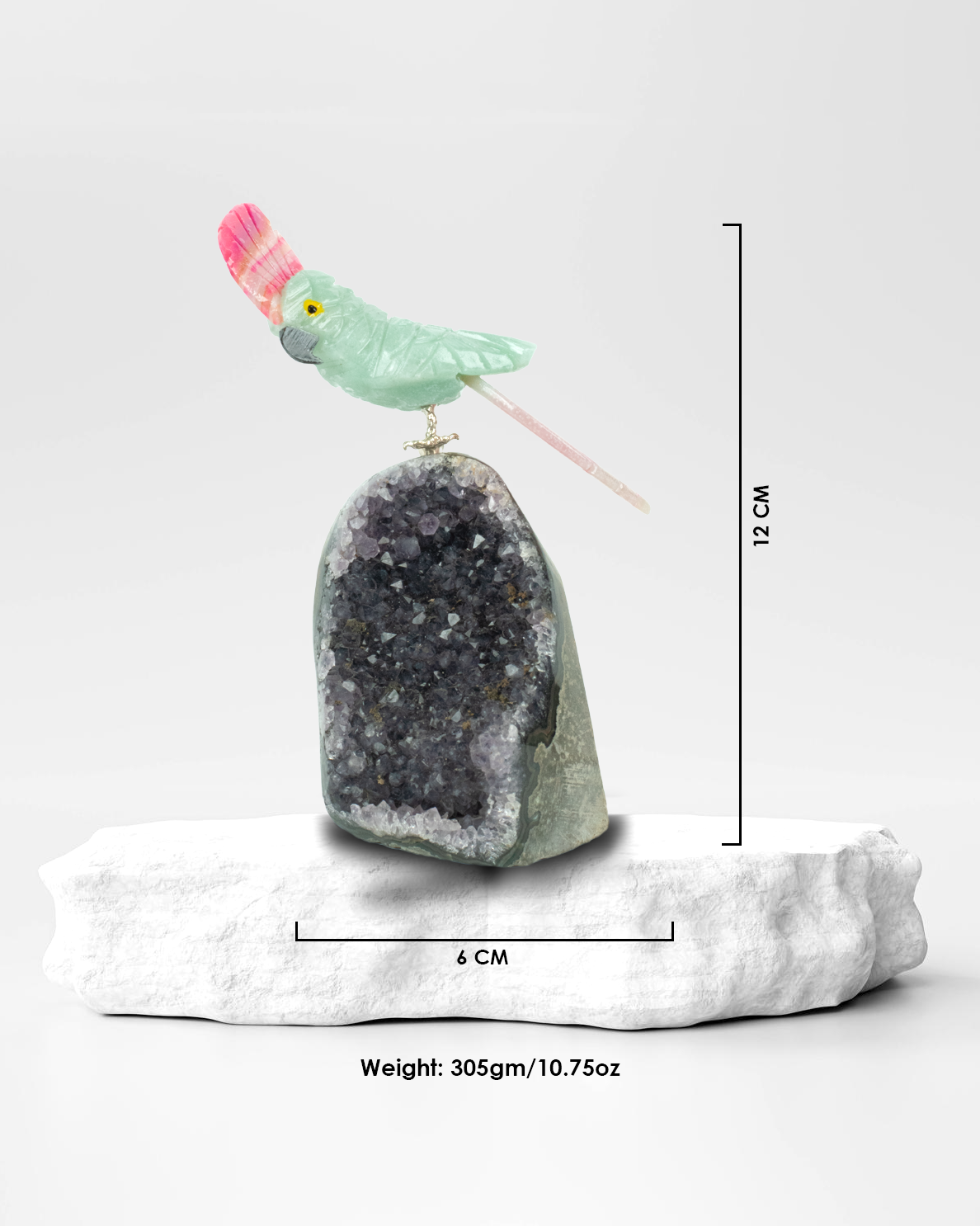 At the center of the bird rests Green Quartz, a soothing crystal known to rejuvenate the heart and attract emotional clarity. It gently opens the heart chakra, encouraging forgiveness, emotional balance, and the release of stress. With its soft green glow, it symbolizes growth, harmony, and the nurturing power of the Earth.