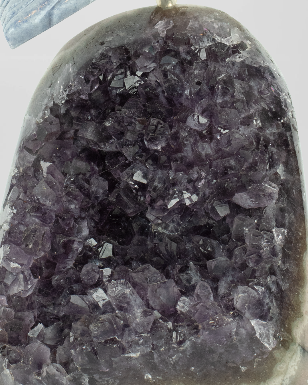 The bird stands firmly on a raw Amethyst cluster, grounding its celestial energy with a calming, protective foundation. Amethyst is a beloved crystal of peace, making it the perfect anchor for this thoughtful, spiritually resonant sculpture.