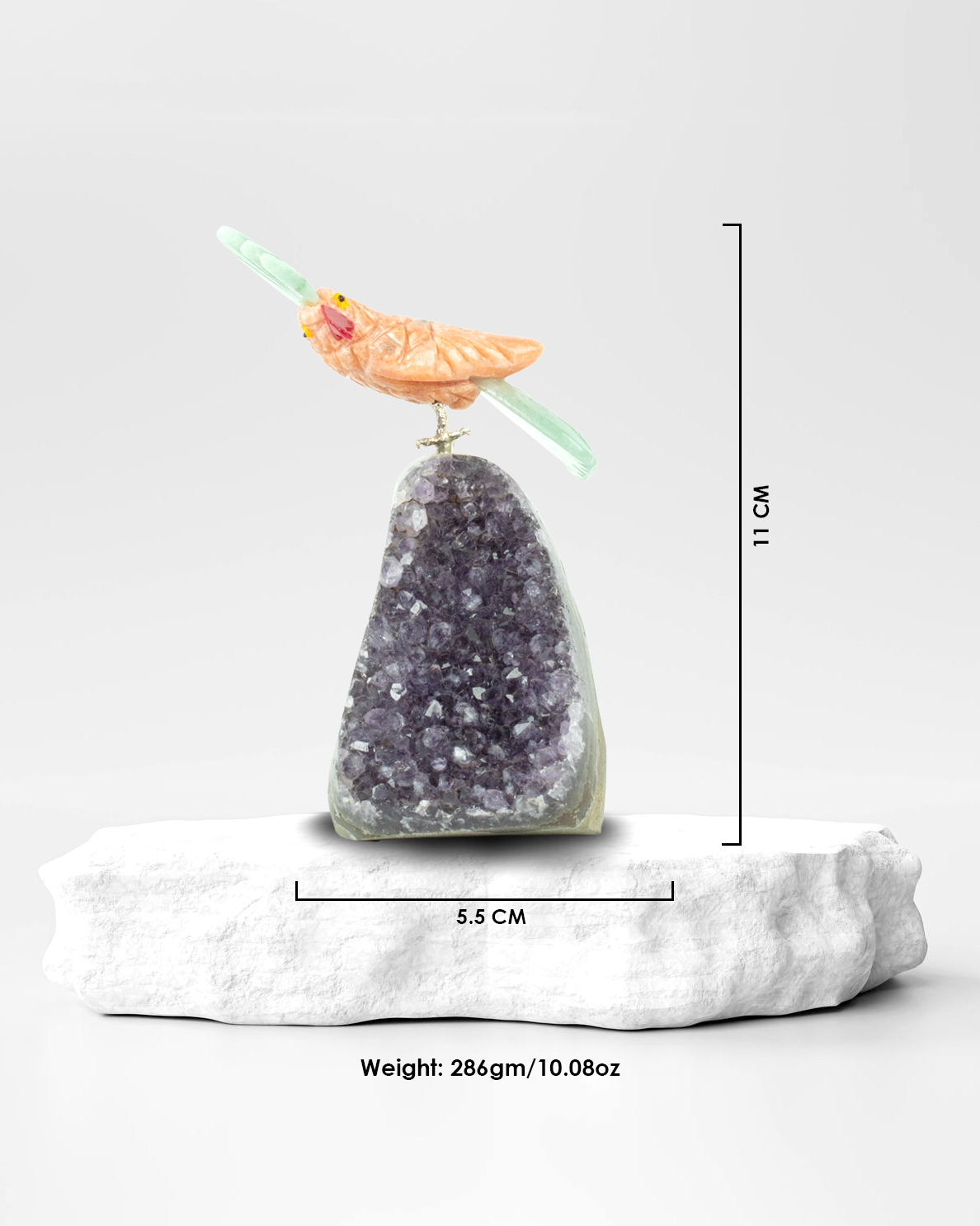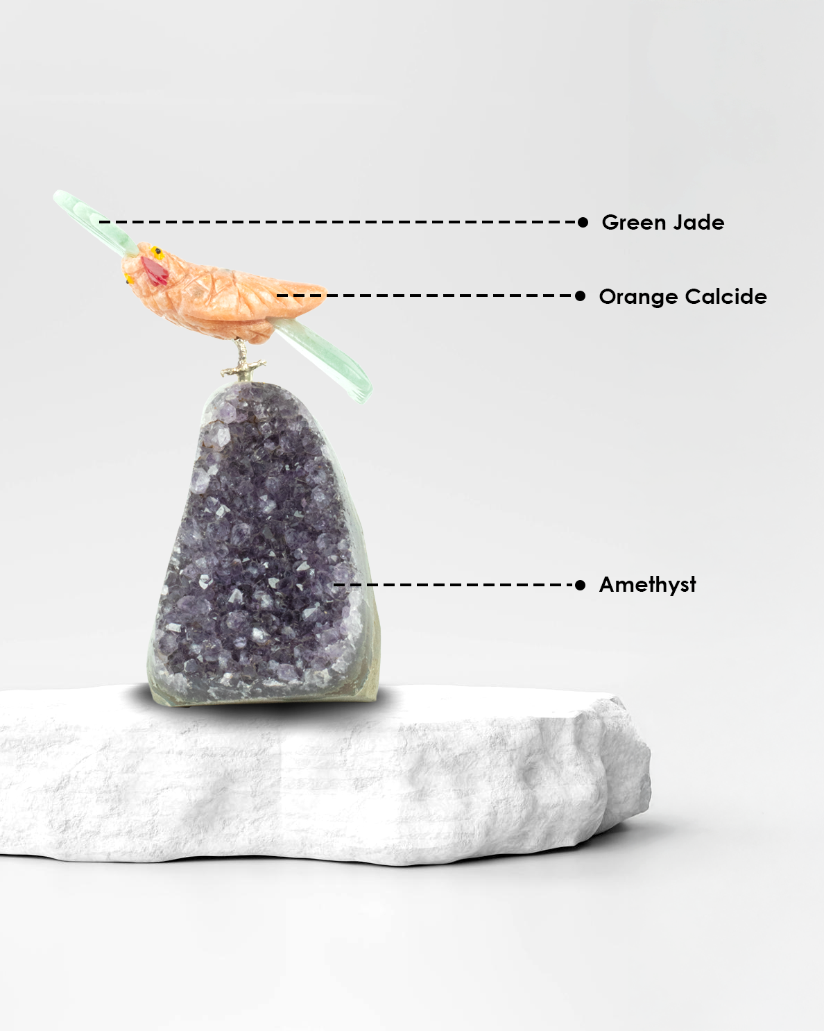 The crown and tail of the bird are carved from Green Jade, a timeless stone of prosperity and protection. Celebrated in ancient Eastern cultures for centuries, Green Jade is believed to attract good luck, promote emotional healing, and encourage wisdom through tranquility. Its lush green hue reflects the grounding energy of nature and symbolizes spiritual growth, fertility, and renewal.