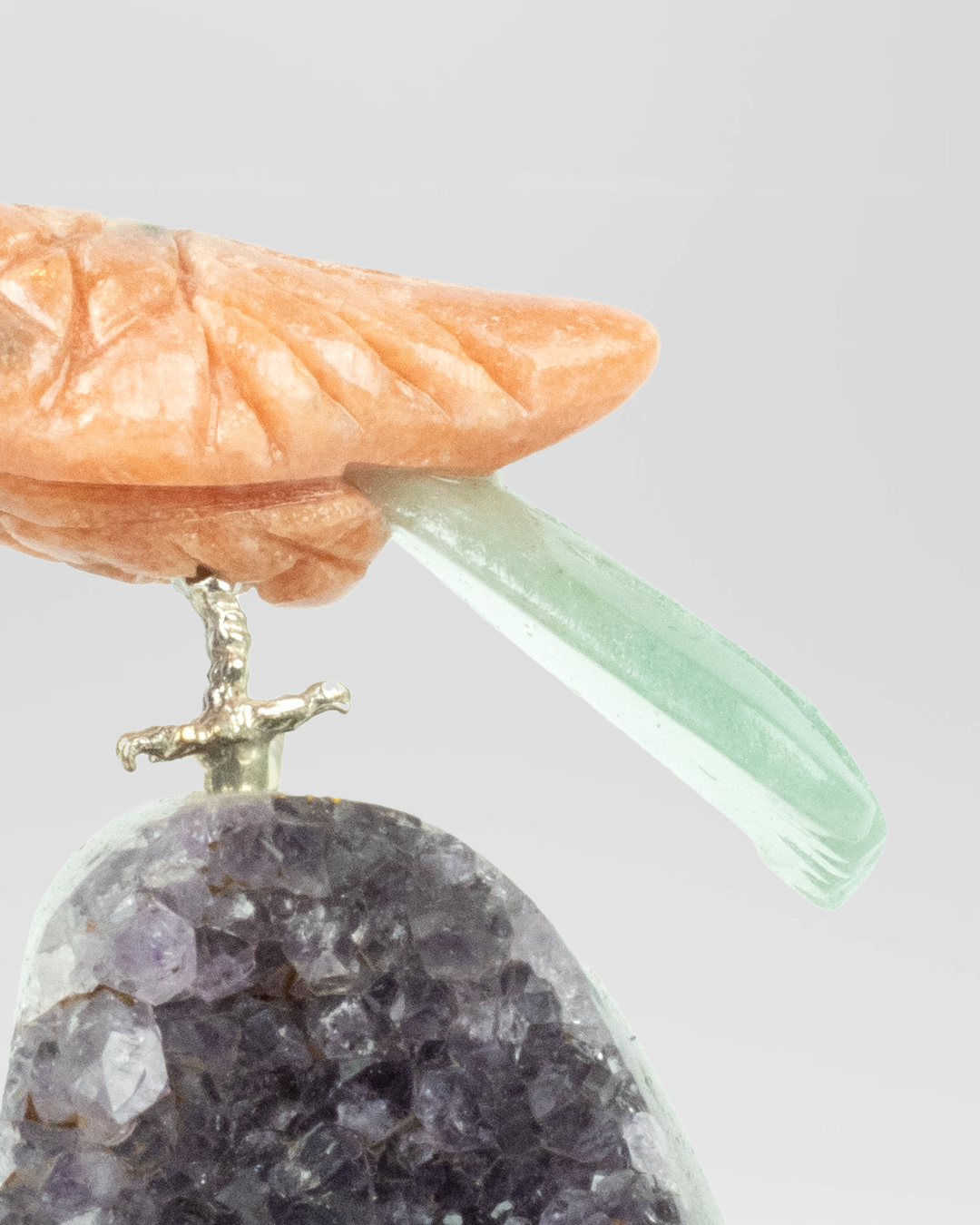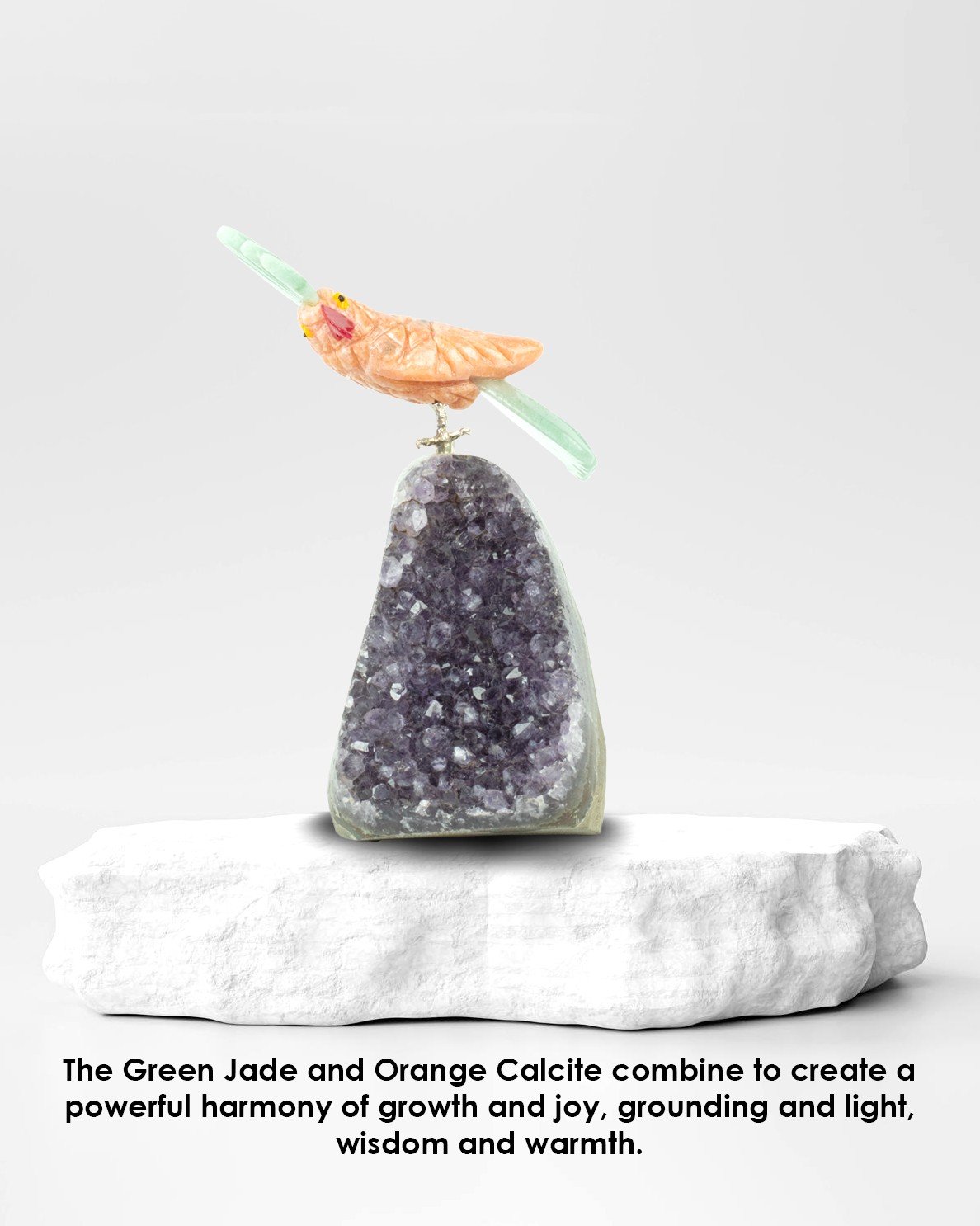 Together, the Green Jade and Orange Calcite combine to create a powerful harmony of growth and joy, grounding and light, wisdom and warmth. The bird, often seen as a messenger of the spirit, becomes a symbol of elevation — rising above fear, guided by intuition and energized by purpose.