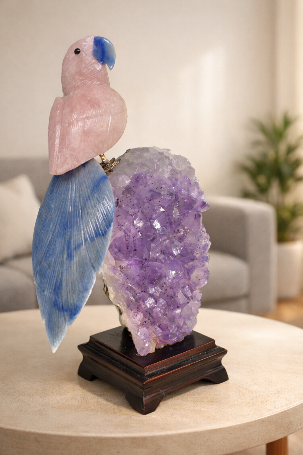The body of the parrot is crafted from Rose Quartz, known for its gentle pink hue and smooth, polished finish that gives the sculpture a warm and soothing appearance. The tail is made from Lapis Lazuli, adding a striking deep-blue contrast that enhances the visual appeal and symbolizes depth and wisdom.